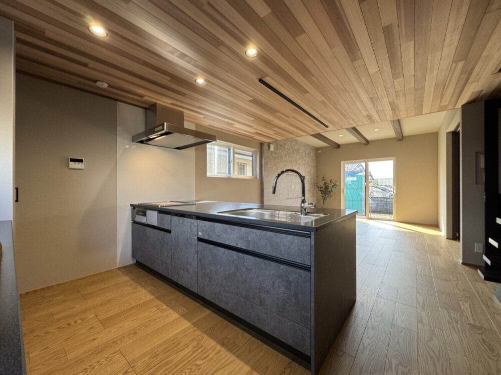 石目調のフラット対面キッチンを合わせて