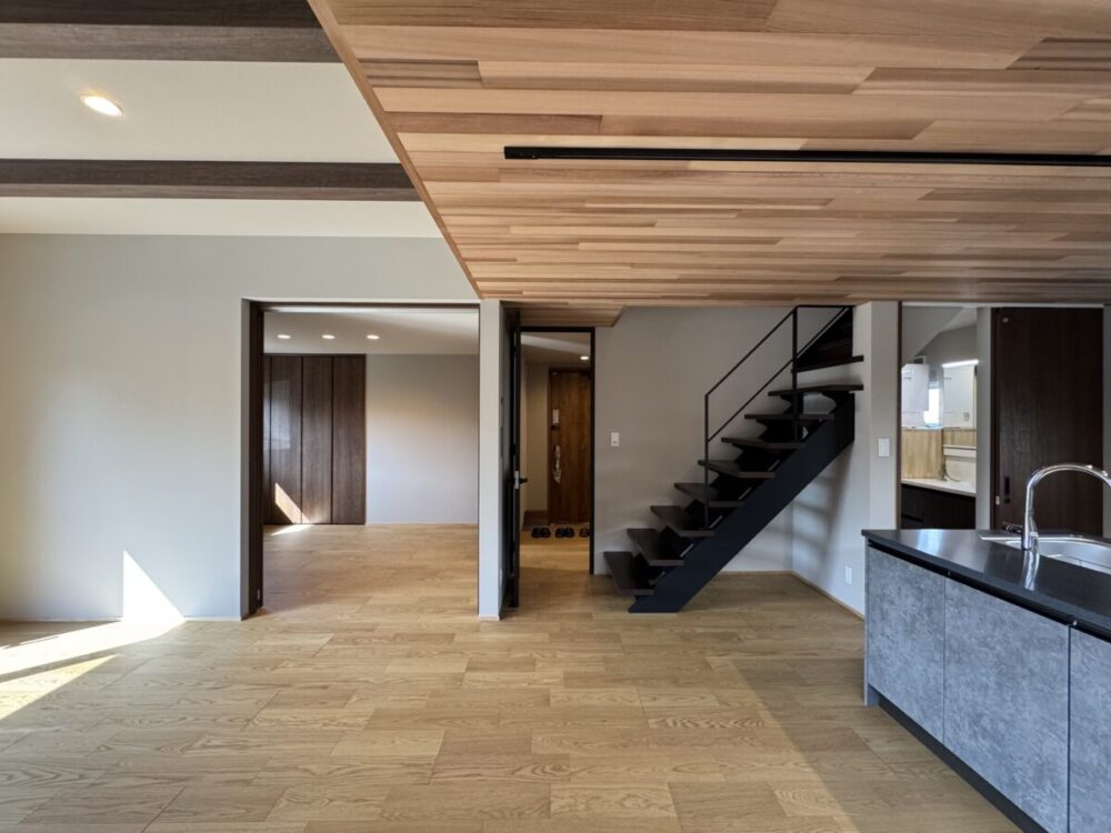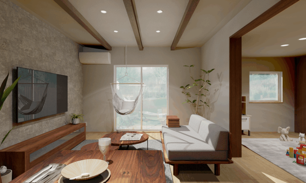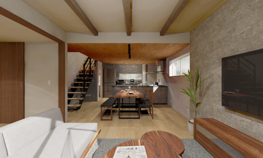 リビングには『折り上げ天井+見せ梁』で