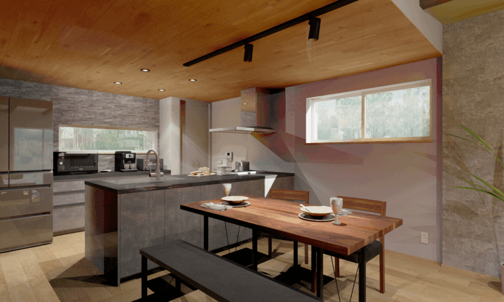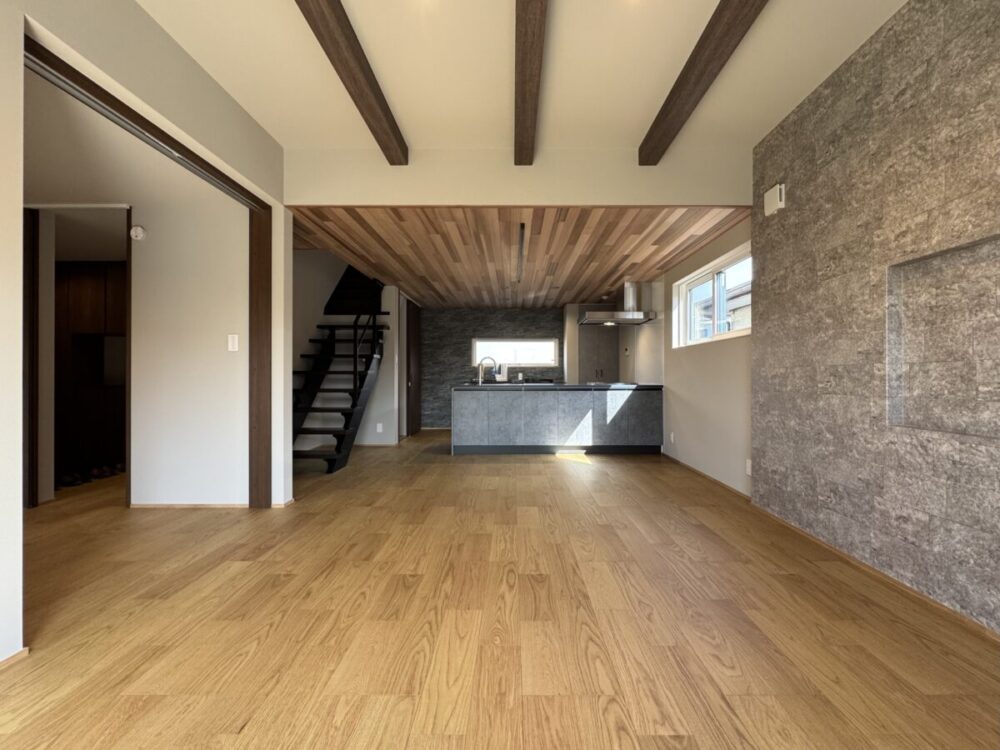 ▪ 天然木レッドシダー貼り天井と見せ梁のあるLDK空間