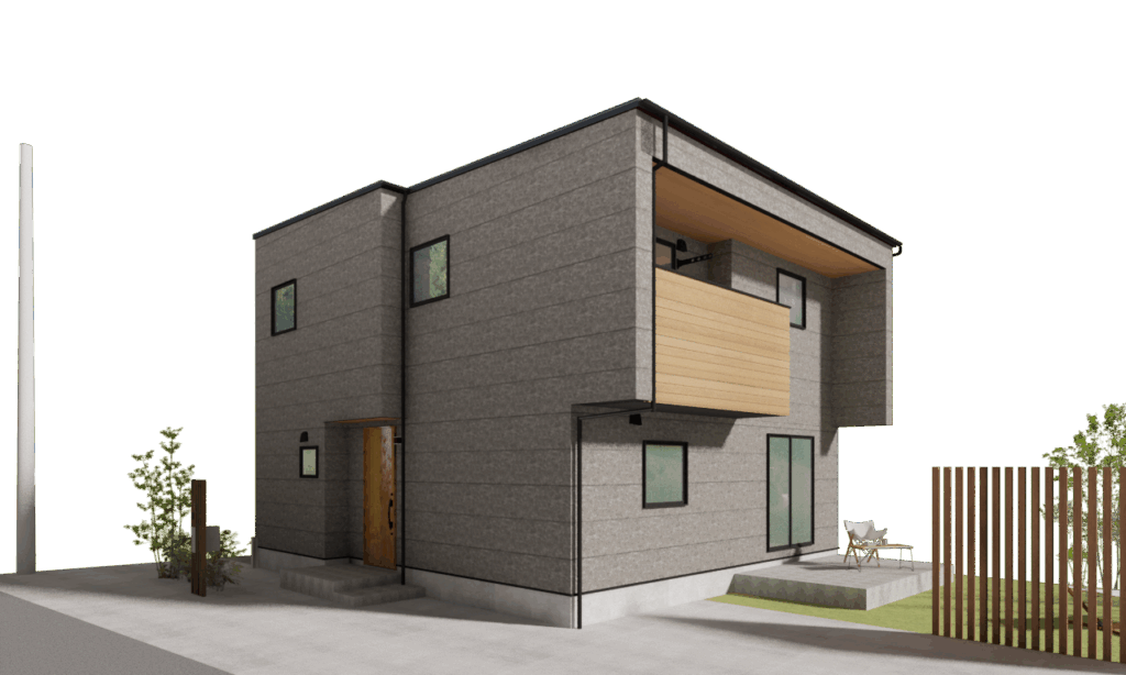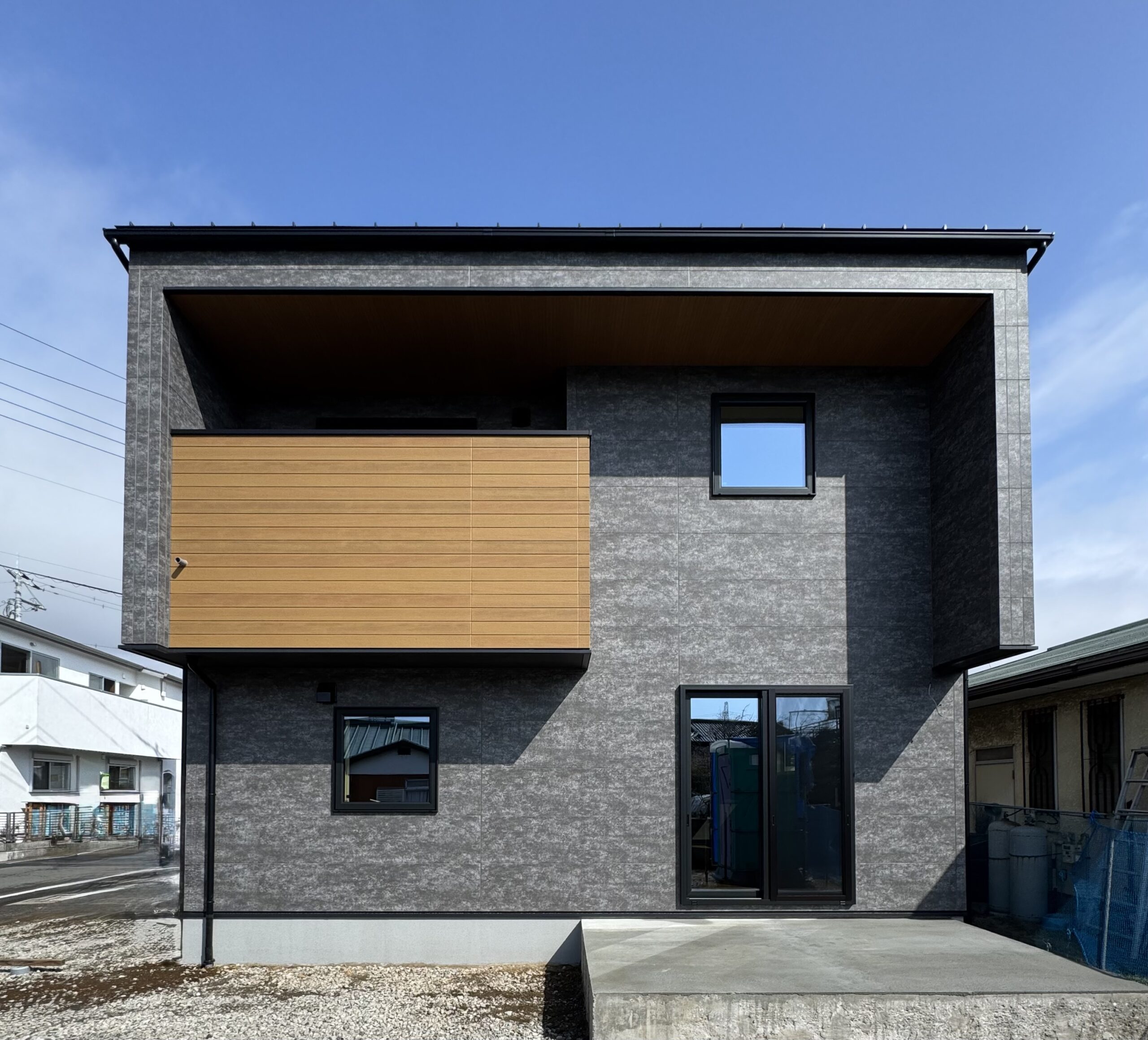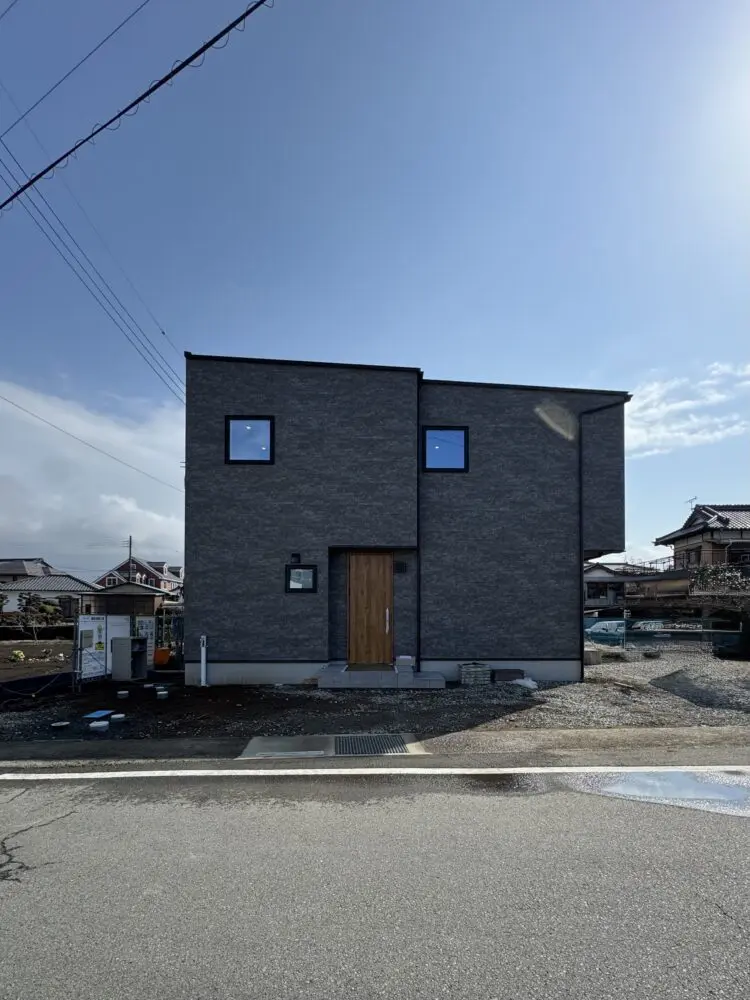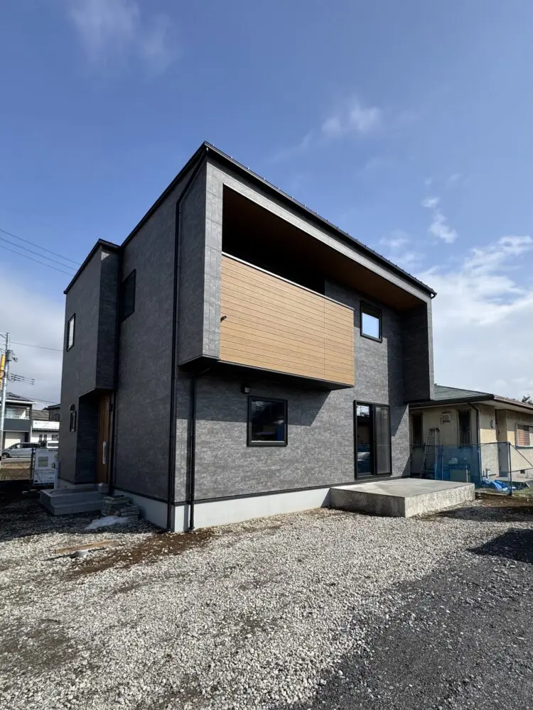 【“ダークグレー×木目”のモダンデザイン外観】