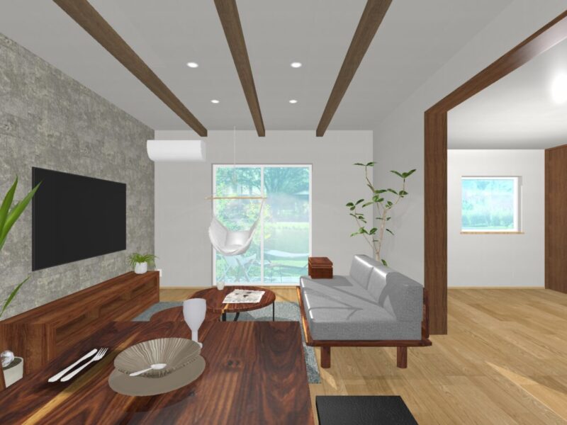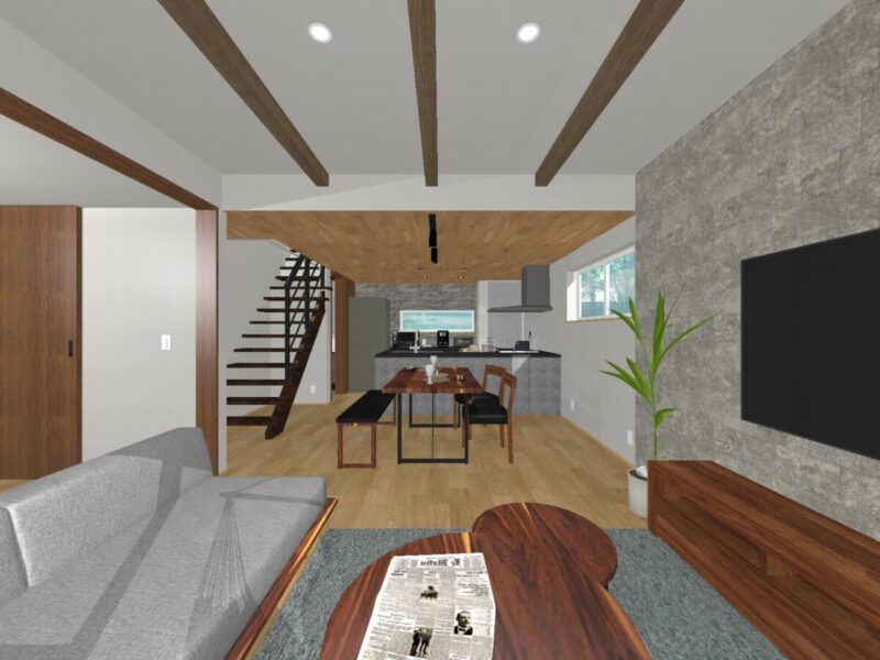 リビングには『折り上げ天井+見せ梁』で