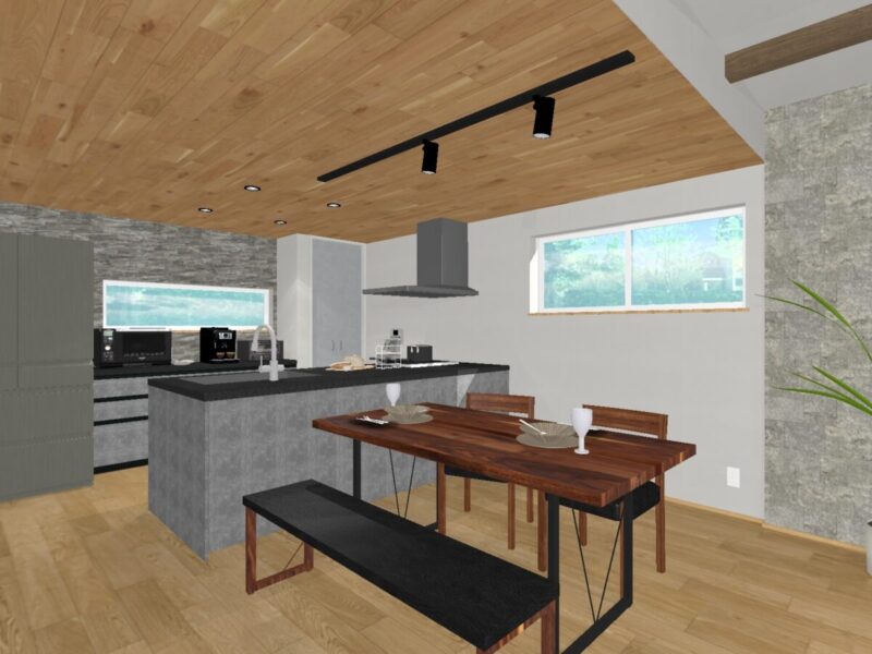 石目調のフラット対面キッチンを合わせて