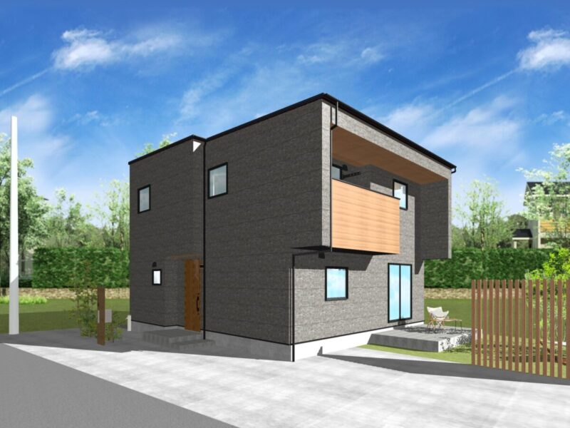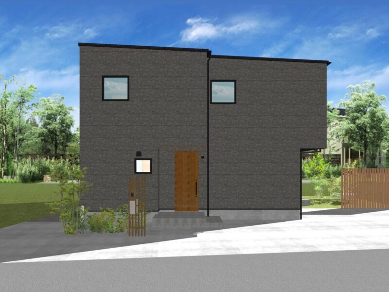 【“ダークグレー×木目”のモダンデザイン外観】