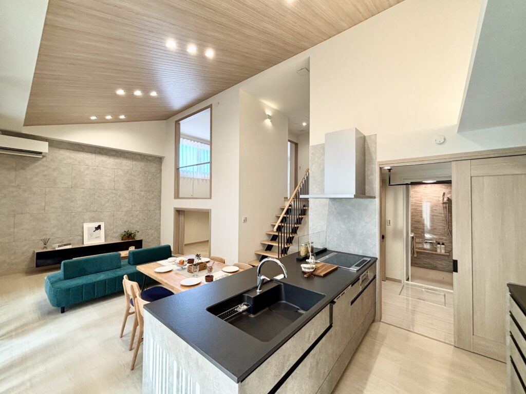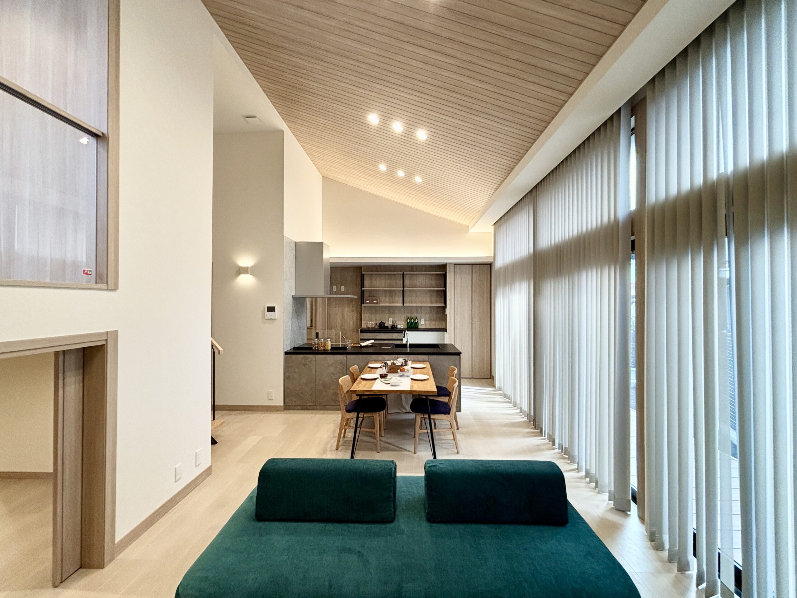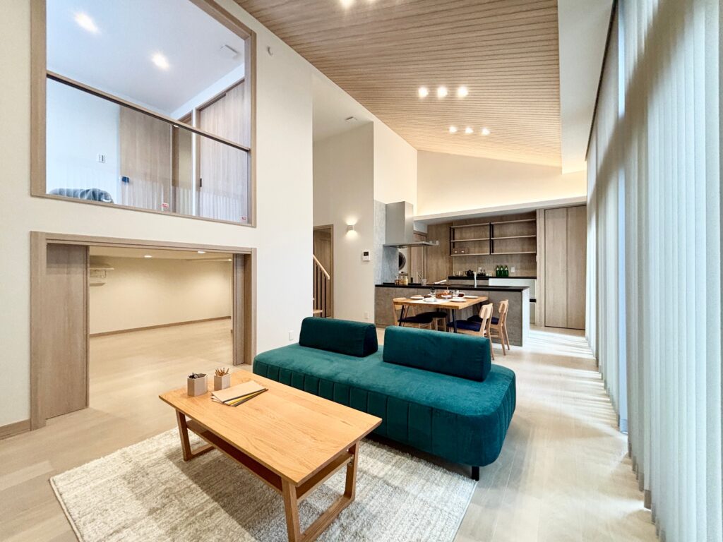 ・最大高4.2m、羽目板の勾配天井で明るく開放的なリビング